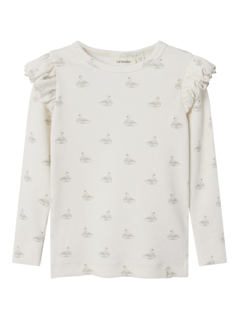 Søde leggings fra Lil’ Atelier Mini i hvid med det fineste print af svaner og en elegant ribstruktur. Leggingsene har en klassisk slim fit pasform i blød og strækbar bomuldskvalitet, som giver både komfort og bevægelsesfrihed. Den brede elastikkant med små flæsedetaljer fuldender looket, mens de forstærkede kanter ved benene sikrer en god holdbarhed.