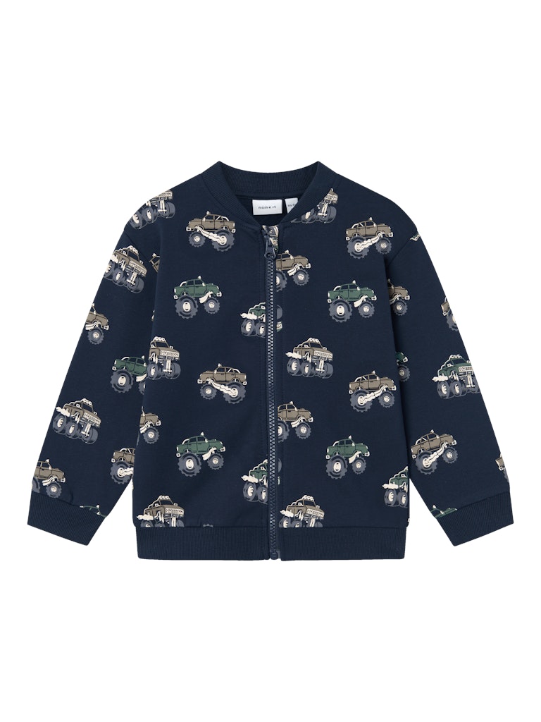 Lækre sweatpants/joggingbukser fra Name It i en dyb mørk blå nuance med sejt print af monster trucks. Joggingbukserne har en klassisk pasform i blød og strækbar bomuldskvalitet, som giver god bevægelighed til leg og hverdag. I livet er der en indvendig justerbar elastik samt et bindebånd foran, og ved benåbningerne sidder brede ribkanter for et komfortabelt finish. Børstede kvaliteter har en blød inderside, som giver ekstra varme og høj komfort.